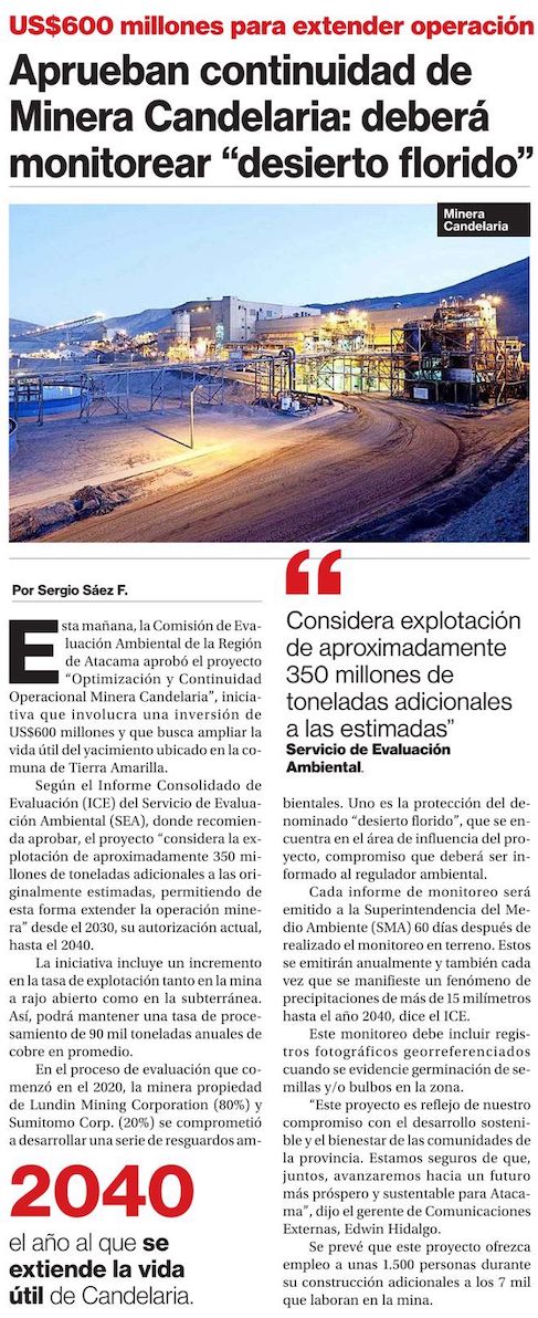 Aprueban continuidad de faena Candelaria - (El Mercurio de Santiago)
