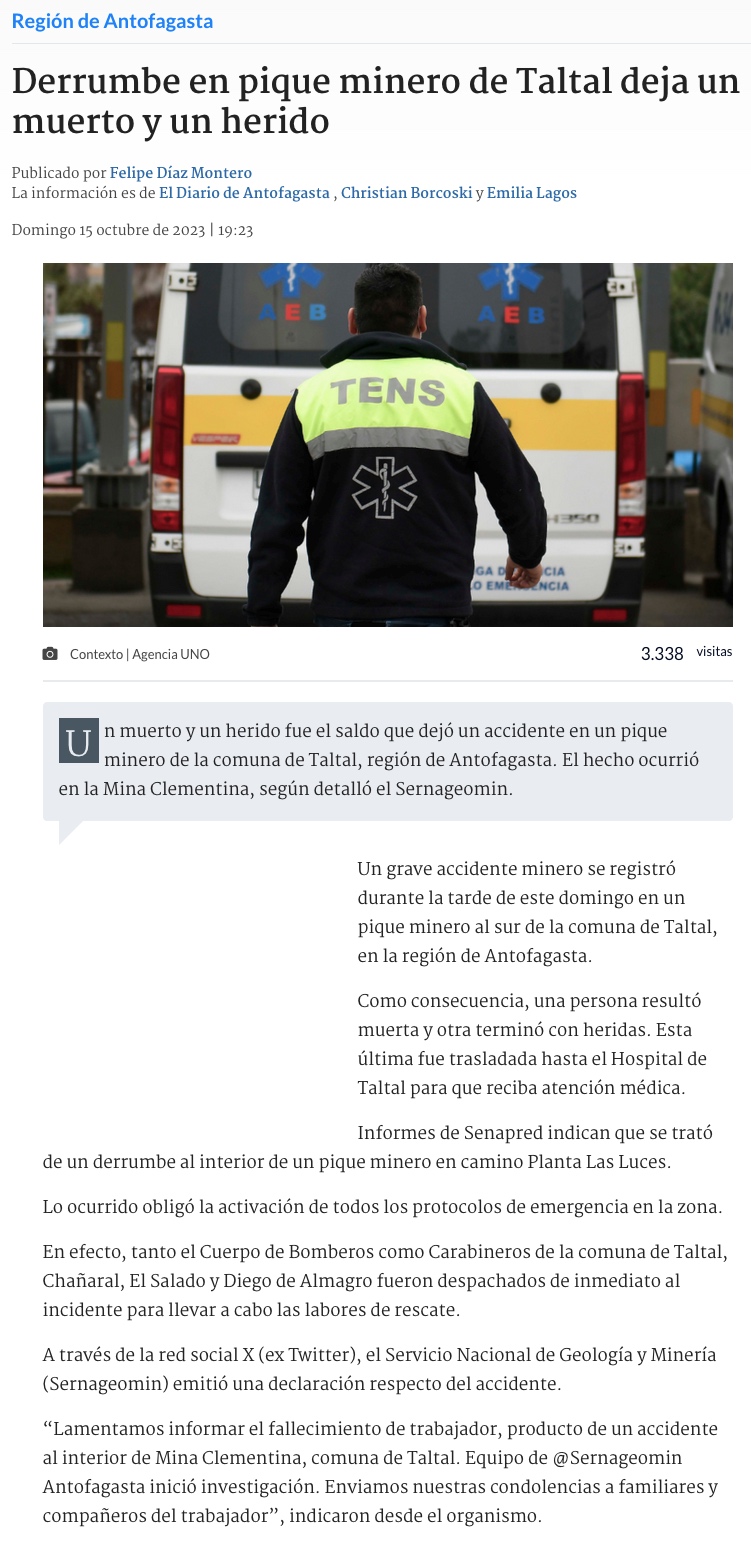 Grave accidente minero en Taltal dejó como resultado una víctima fatal y un lesionado - (diarioangamos)