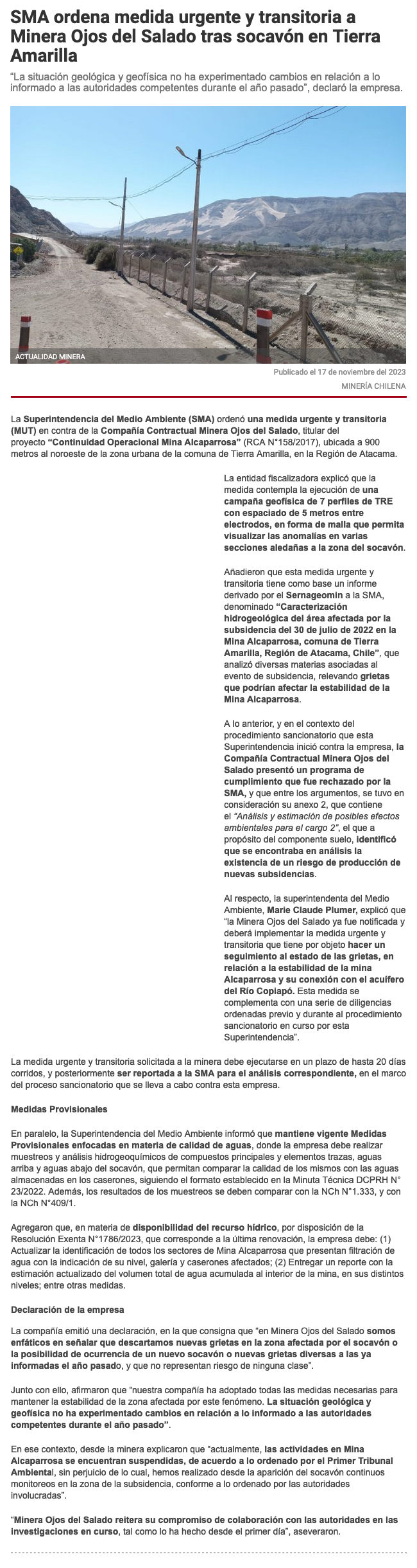 SMA ordena a Minera Ojos del Salado implementar medidas urgentes y transitorias - (El Diario de Atacama)
