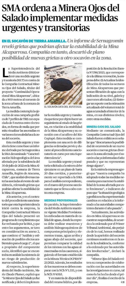 SMA ordena medida urgente y transitoria a Minera Ojos del Salado tras socavón en Tierra Amarilla - (mch.cl)