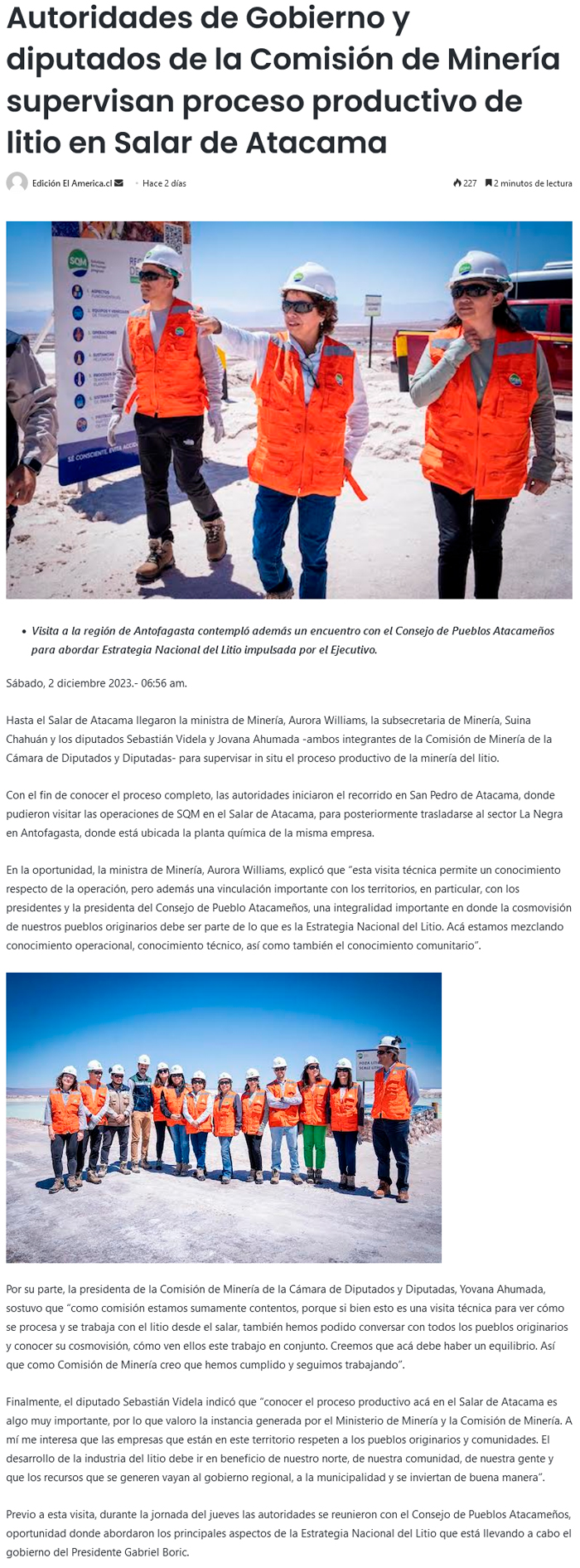 Autoridades de Gobierno y diputados de la Comisión de Minería supervisan proceso productivo del litio en el Salar de Atacama - (El Mercurio de Antofagasta)