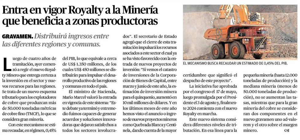 Ayer entró en vigencia nuevo royalty con esquema que grava a la gran minería - (El Mercurio de Santiago)