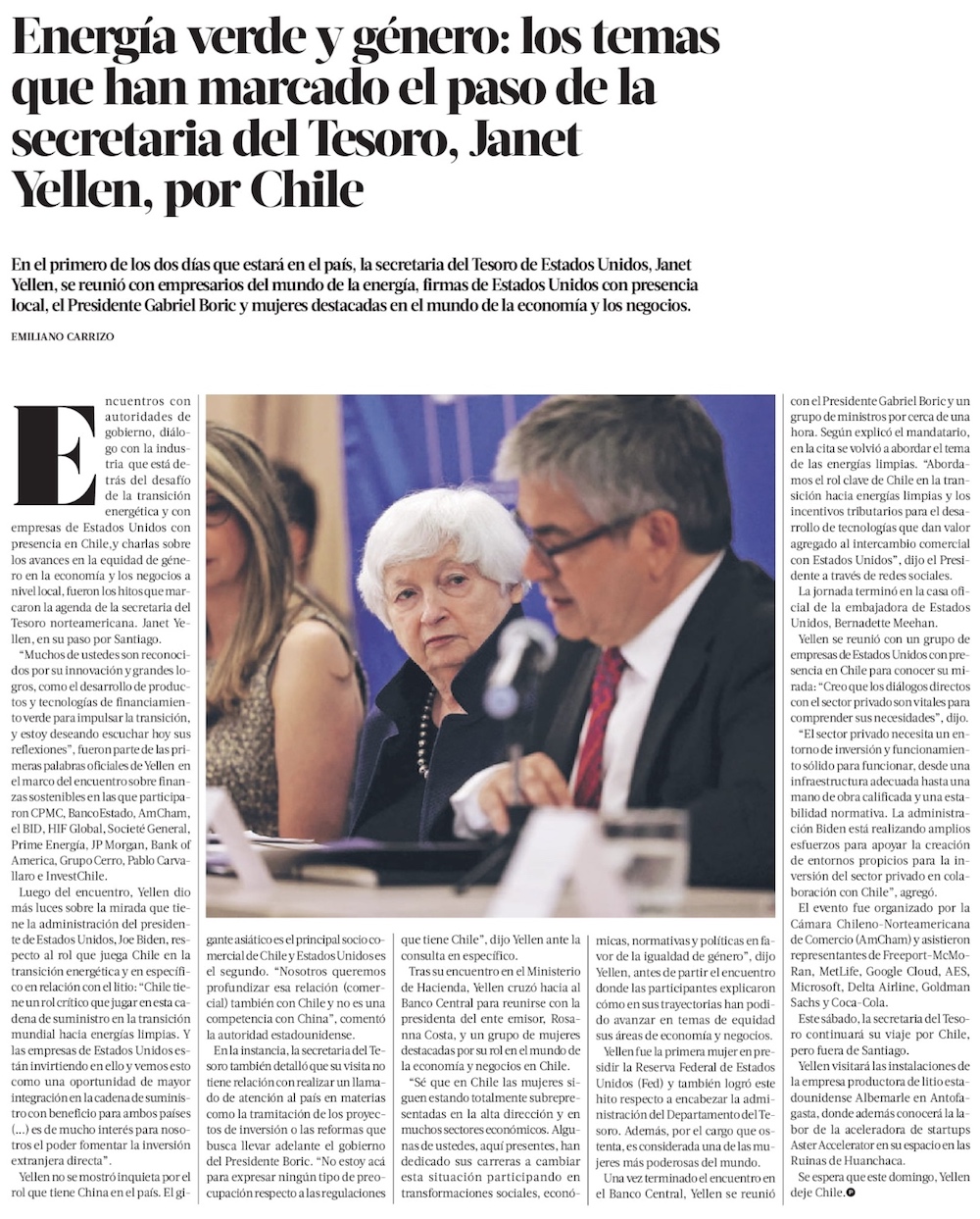 Yellen remarca a Chile como socio “estratégico” en energías limpias - (El Mercurio de Santiago)