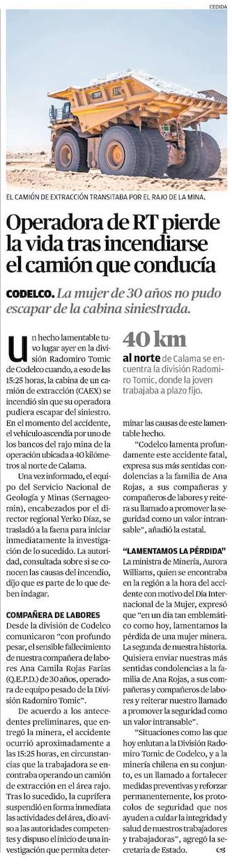 DT suspende faenas en mina por muerte de trabajadora - (El Mercurio de Santiago)