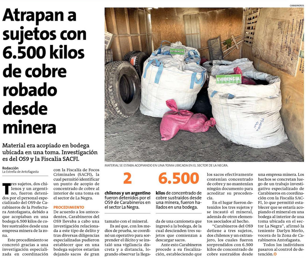 Capturan a tres sujetos que tenías 6.500 kilos de cobre robado - (El Mercurio de Antofagasta)