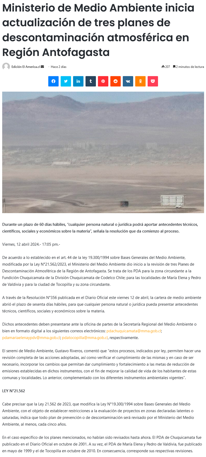 Medio Ambiente inicia actualización del Plan de Descontaminación Atmosférica de la zona - (El Mercurio de Calama)