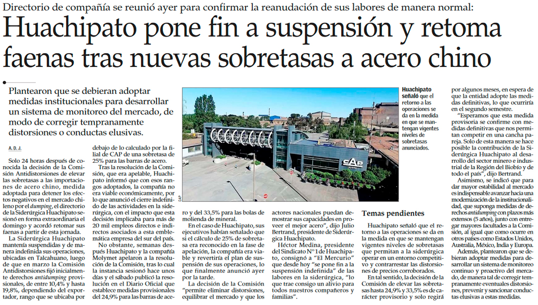 Huachipato dice que revertirá suspensión tras fijación de sobretasas más altas a importaciones de acero - (Diario Financiero)