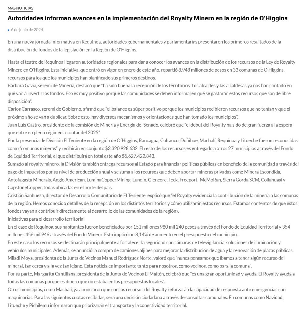 Autoridades informan avances en la implementación del Royalty Minero en la región de O’Higgins - (El Rancagüino)