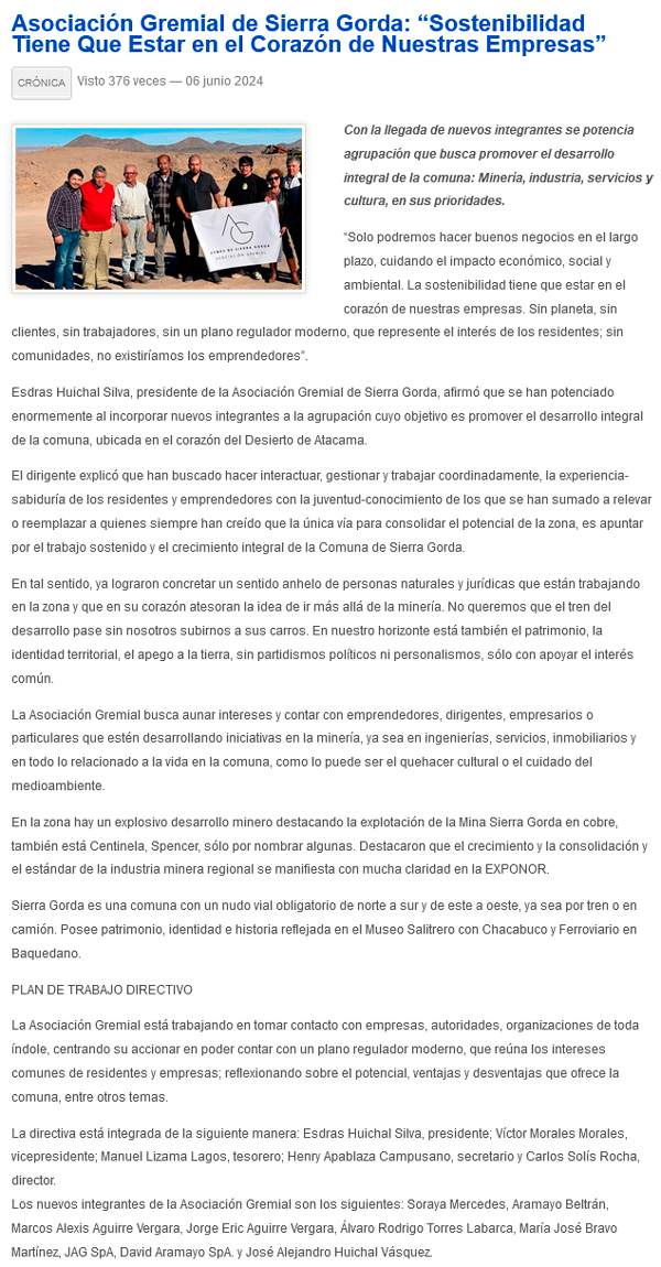 Asociación gremial de Sierra Gorda: “sostenibilidad tiene que estar en el corazón de nuestras empresas” - (norte360.cl)