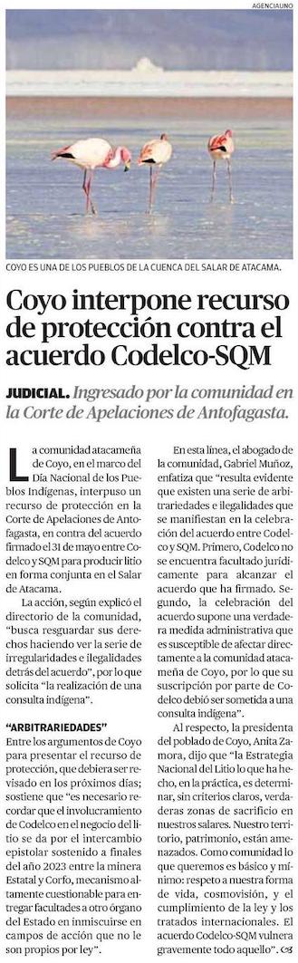 Tribunal acoge a tramitación recurso de protección contra acuerdo Codelco-SQM - (El Mercurio de Antofagasta)