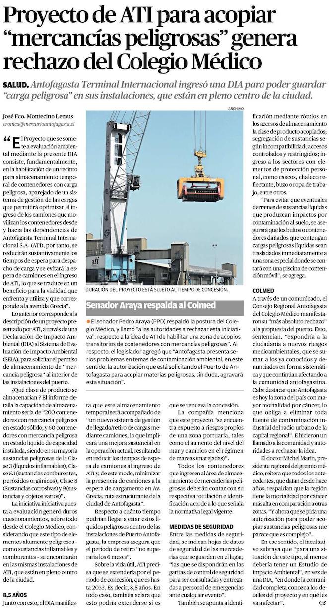 Voces transversales se suman a las críticas por proyecto de acopio de cargas peligrosas de ATI - (El Mercurio de Antofagasta)