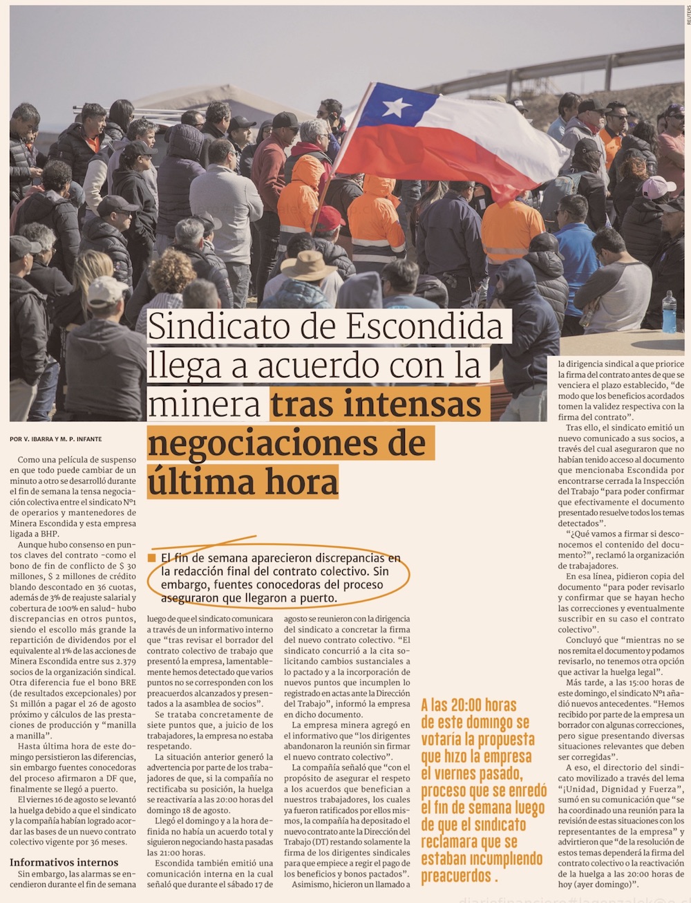Sindicato N°1 de Minera Escondida logra bonos y beneficios inéditos para la industria minera - (El Mercurio de Antofagasta)