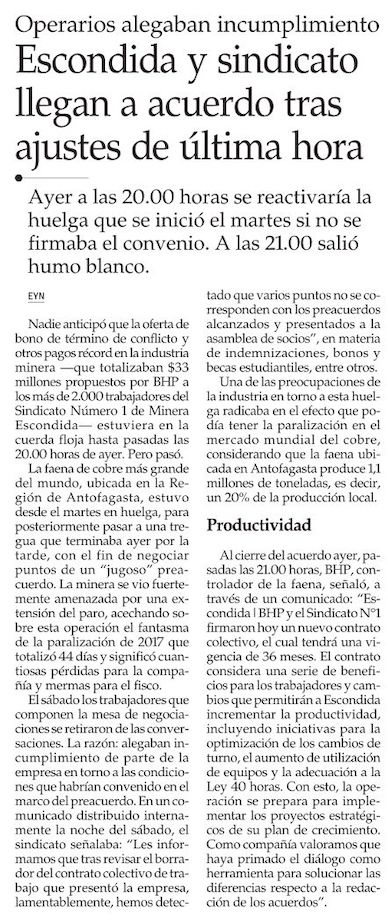 Millonario acuerdo zanja conflicto en Minera Escondida - (La Segunda)