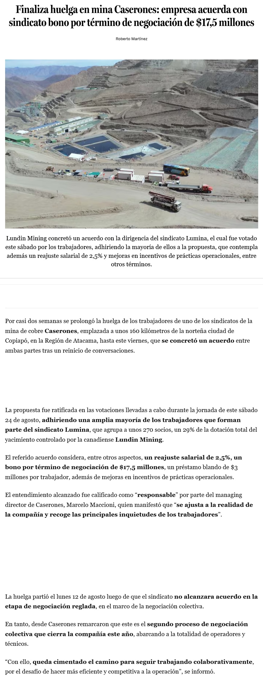 Termina huelga en Caserones: acuerdo incluye bono y préstamo 'blando' por 20,5 millones por trabajador - (soycopiapo)