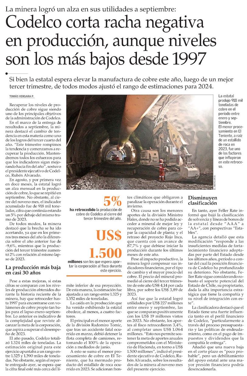 Codelco aumenta su producción en un 2% en el tercer trimestre - (El Mercurio de Antofagasta)