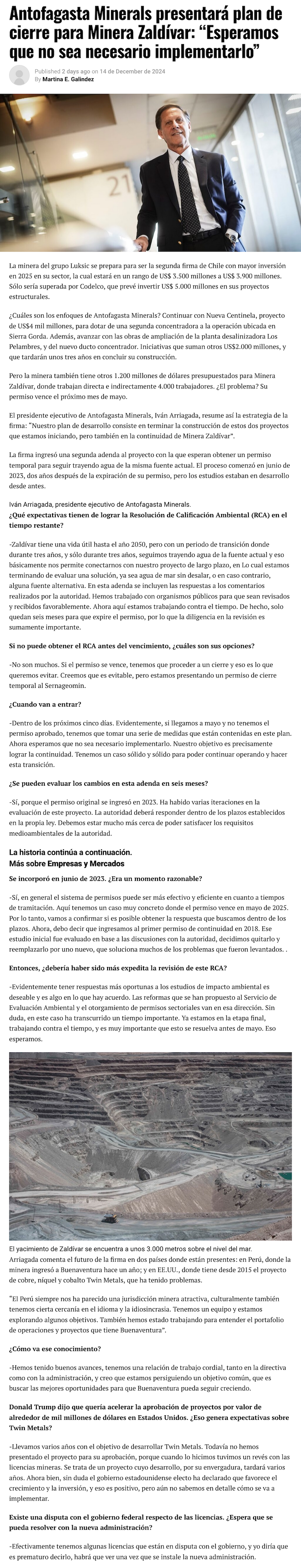 Antofagasta Minerals presentará plan de cierre para Minera Zaldívar: "Esperamos que no sea necesario implementarlo" - (Pulso)