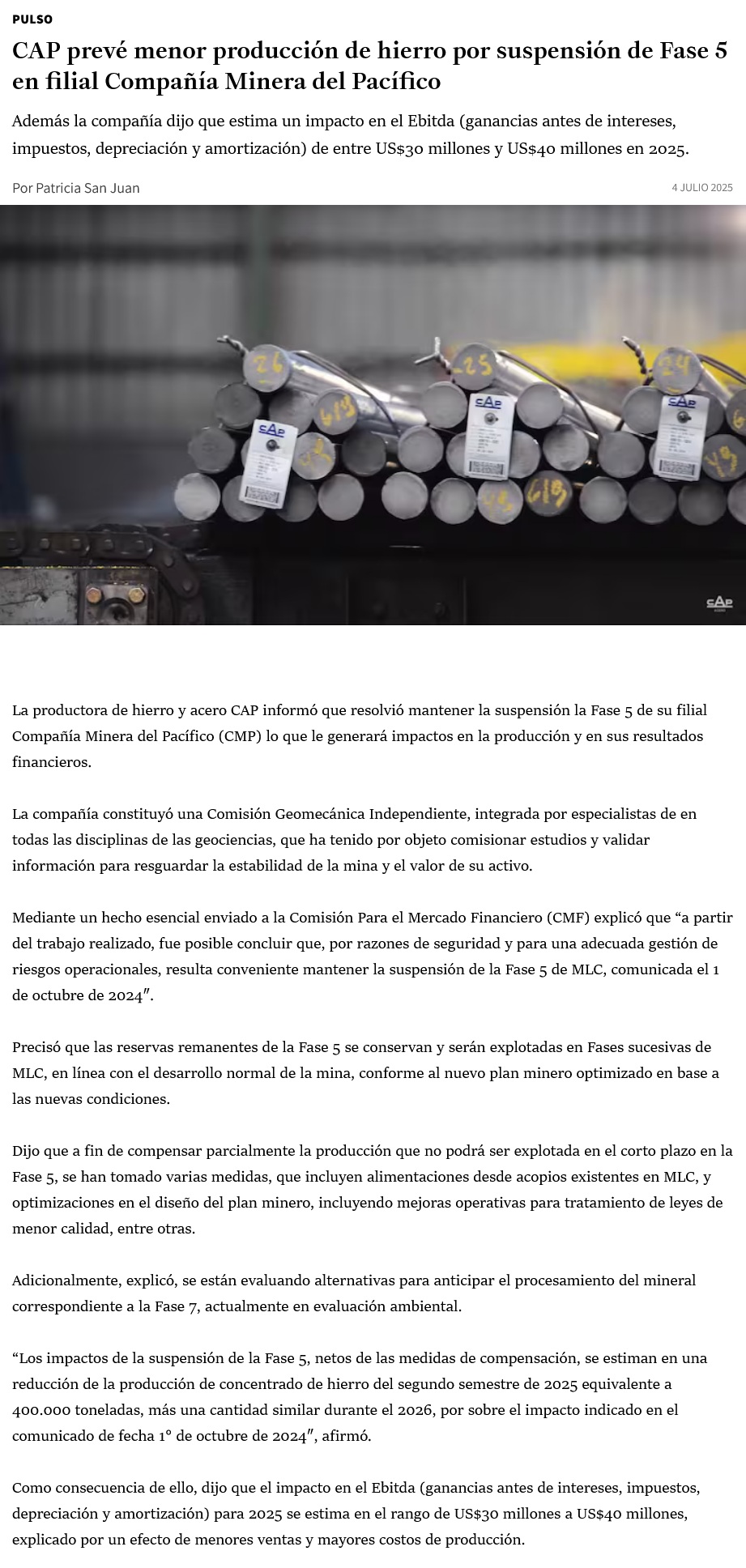 CAP mantendrĂ¡ suspendida la Fase 5 de la faena de la Mina Los Colorados - (electromineria.cl)