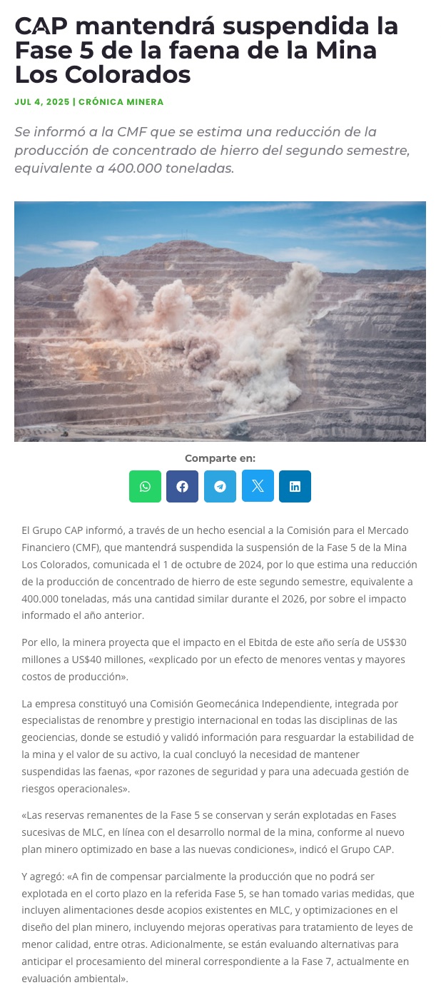 CAP mantendrá suspendida la Fase 5 de Mina Los Colorados - (reporteminero)