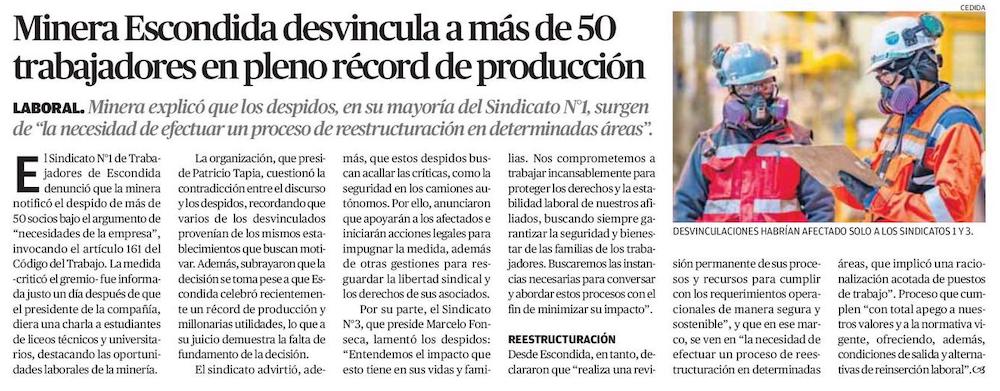Denuncian más de 50 trabajadores despedidos en Minera Escondida - (La Estrella)