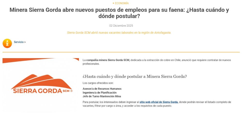 Trabajo en Sierra Gorda SCM: Hay dos vacantes en diciembre de 2025 - (minerialocal.cl)
