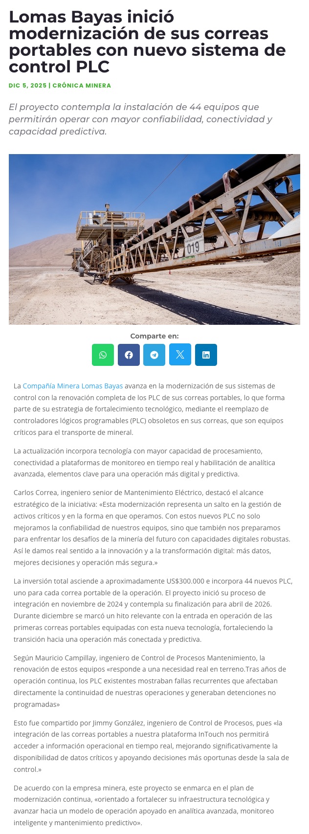 Transformación digital en Lomas Bayas: primeras correas portables entran en operación con PLC de última generación - (diarioangamos)