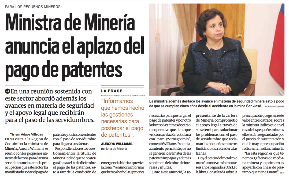 Ministra Williams anunció postergación de pago de patentes a pequeños mineros - (La Región)
