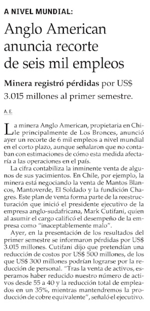 Anglo American recorta 6.000 puestos de trabajo - (El Mercurio de Antofagasta)