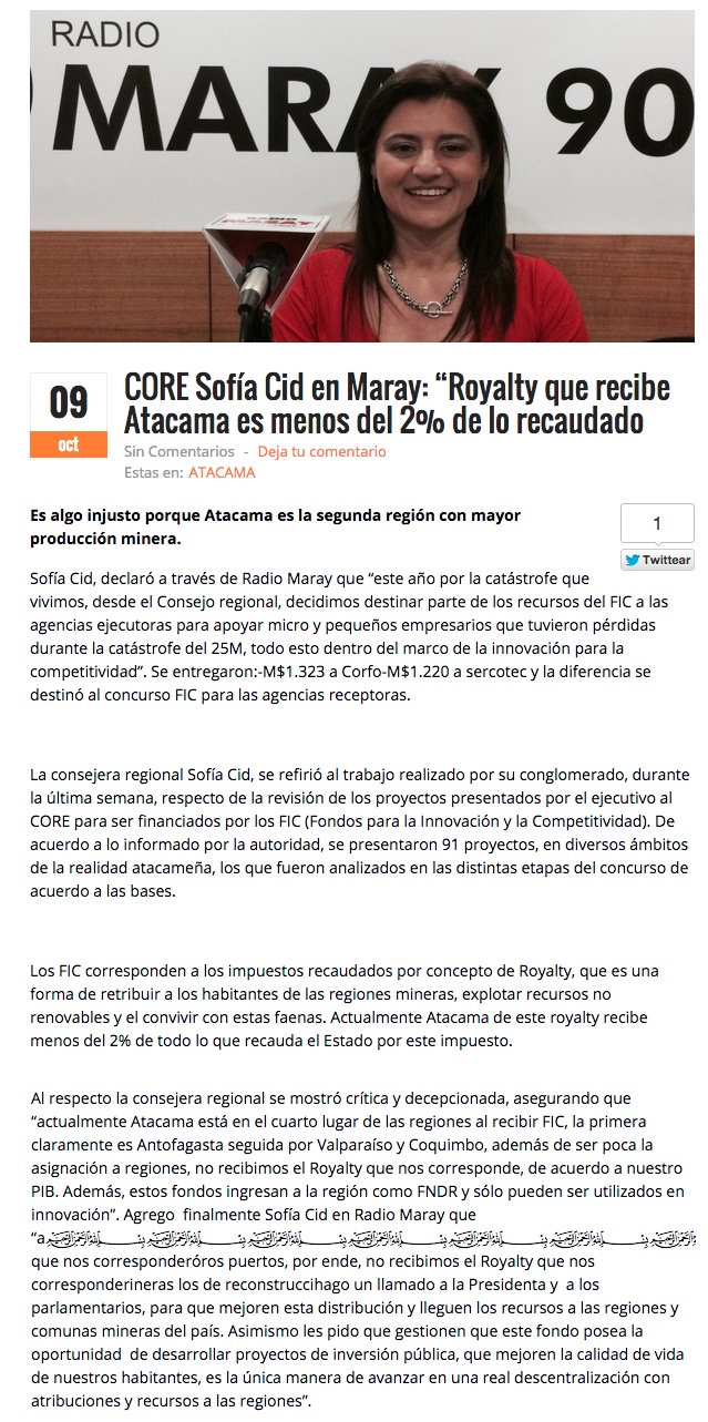 Consejera SofĂa Cid: "Royalty que recibe Atacama es menos del 2% de lo recaudado" - (El Diario de Atacama)