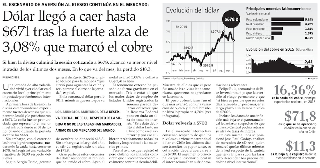 Tipo de cambio caerá, pero volvería a equilibrio de $650 a fines de 2016 - (El Mercurio de Santiago)