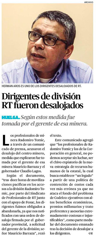 Mantiene huelga en la División RT pese al desalojo - (El Mercurio de Antofagasta)