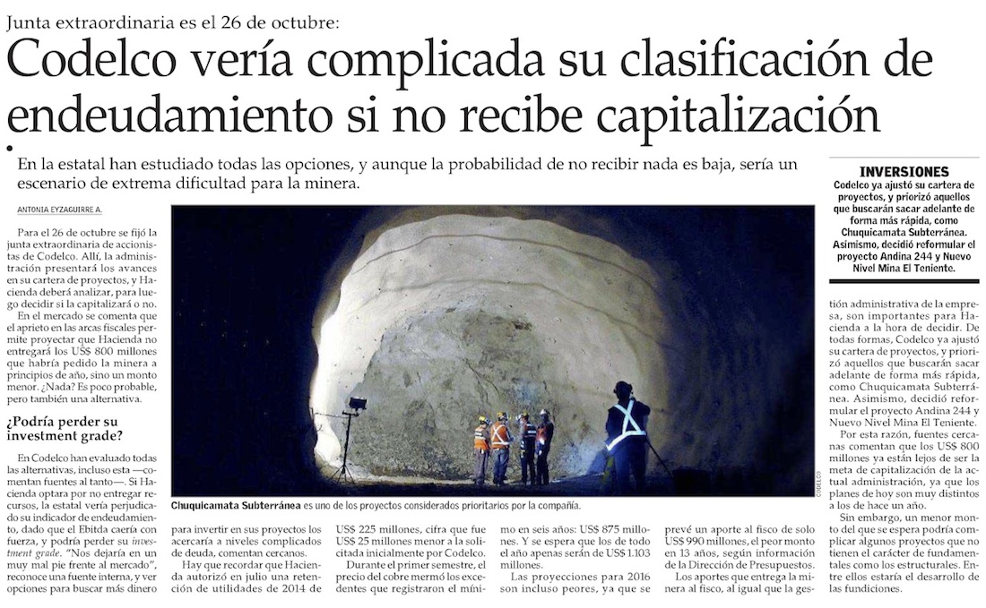 "Chile no tiene planes de aumentar financiamiento de Codelco, por ahora" - (El Mercurio de Santiago)