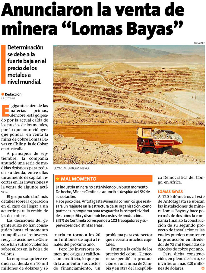 Glencore anunció venta de minera Lomas Bayas para bajar déficit - (El Mercurio de Antofagasta)