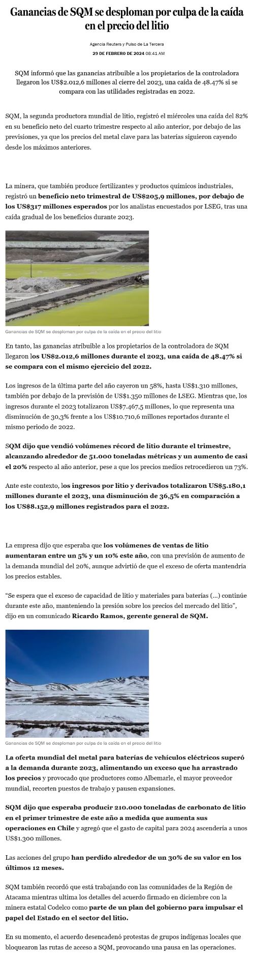 Utilidades de SQM se desploman casi 50% en 2023 producto de la caída en el precio del litio - (emol)