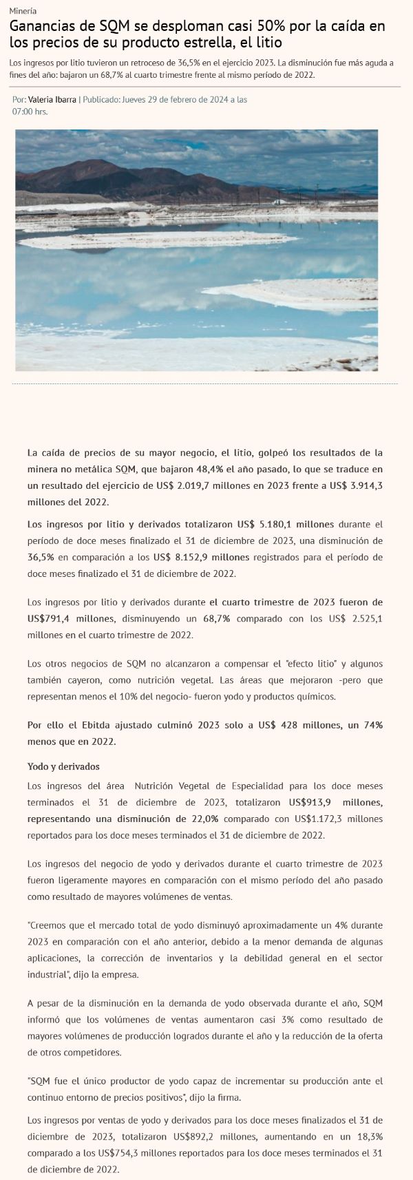 Utilidades de SQM se desploman casi 50% en 2023 producto de la caída en el precio del litio - (emol)