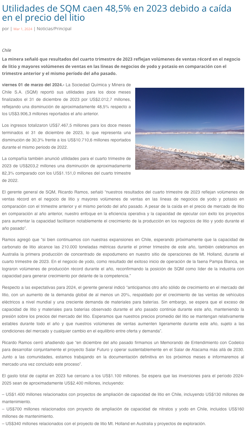 Utilidades de SQM caen en 48,5% en 2023 debido a caída en el precio del litio - (Nostálgica Online)
