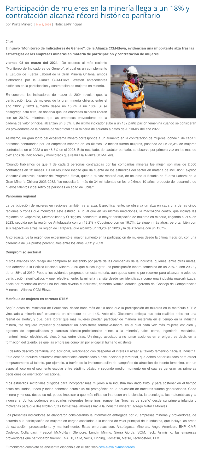 Participación de mujeres en la gran minería de la Región de Antofagasta llega a un 18,2% - (El Mercurio de Antofagasta)