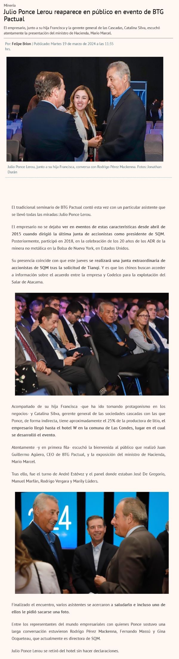 Julio Ponce reaparece en seminario de BTG junto a la hija que encabeza sus negocios - (La Tercera Online)
