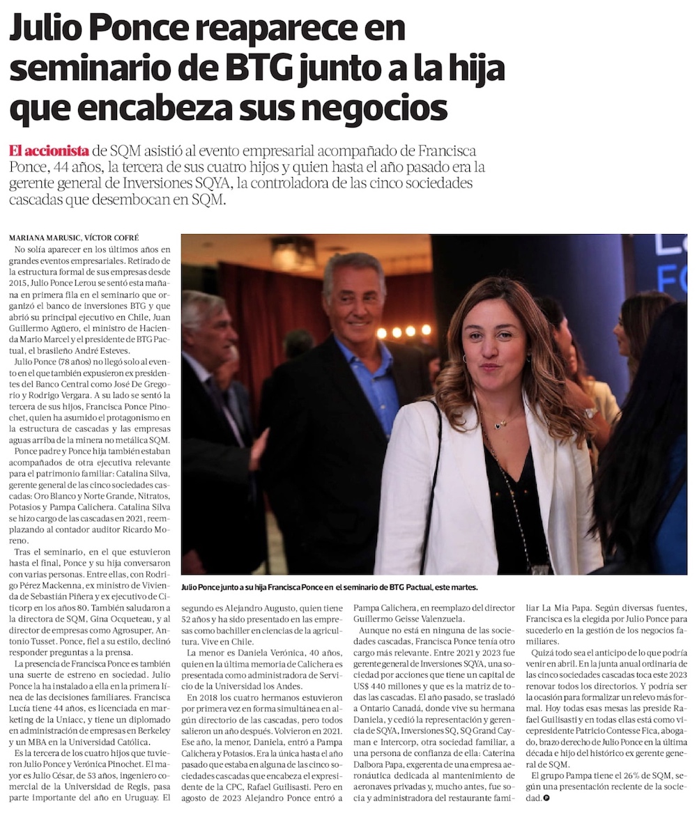 Julio Ponce reaparece en seminario de BTG junto a la hija que encabeza sus negocios - (La Tercera Online)
