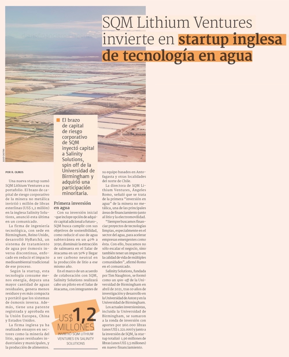 SQM Lithium Ventures invierte 1 millón de libras esterlinas en startup inglesa de tecnología en agua - (DF Online)