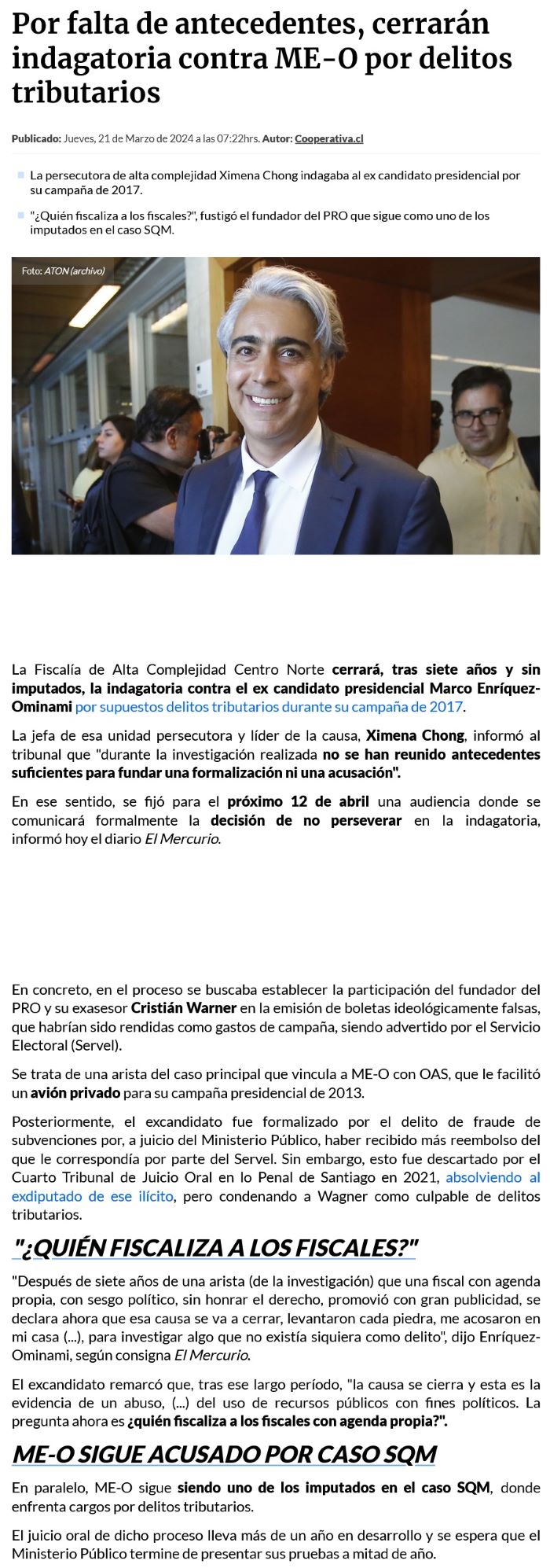 Fiscalía no perseverará en la causa por delitos tributarios en campaña de ME-O - (laNacion)