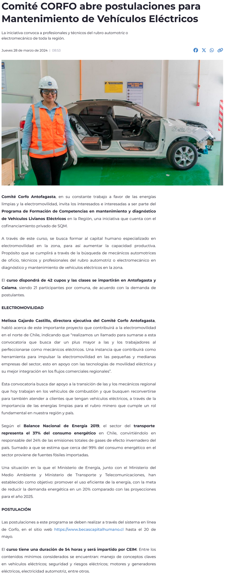 Comité CORFO abre postulaciones para el Programa de Formación de Competencias en Mantenimiento de Vehículos Eléctricos - (antofagastanoticias)