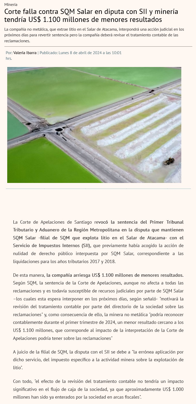 Traspié en disputa con el SII podría llevar a SQM a reconocer un impacto contable por US$ 1.100 millones en el primer trimestre - (La Tercera Online)