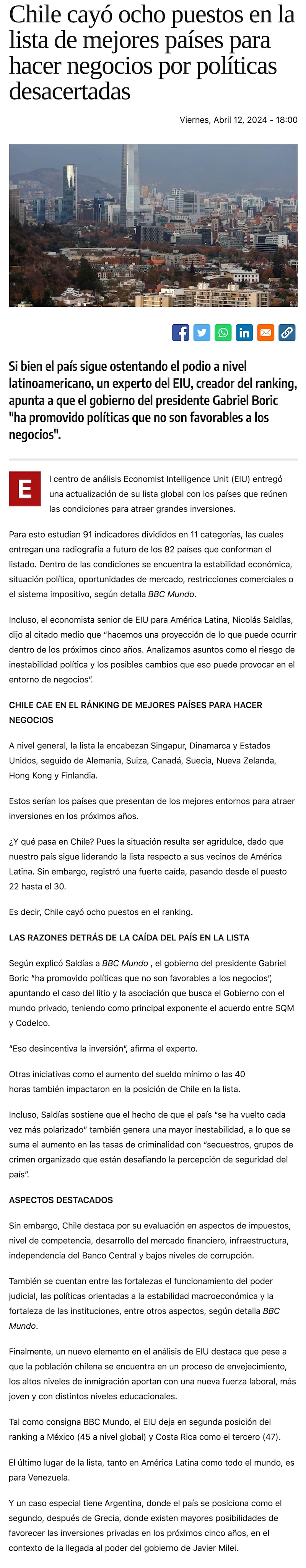 Por "políticas desfavorables": Chile cae varios puestos en lista de mejores países para hacer negocios - (biobiochile online)