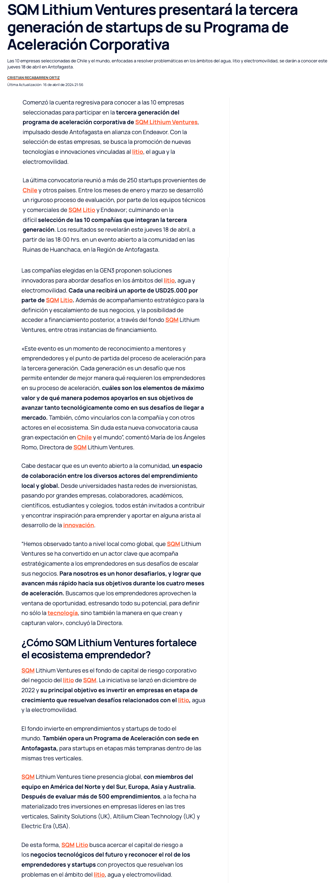 SQM Lithium Ventures presentará la tercera generación de startups de su Programa de Aceleración Corporativa - (reporteminero)