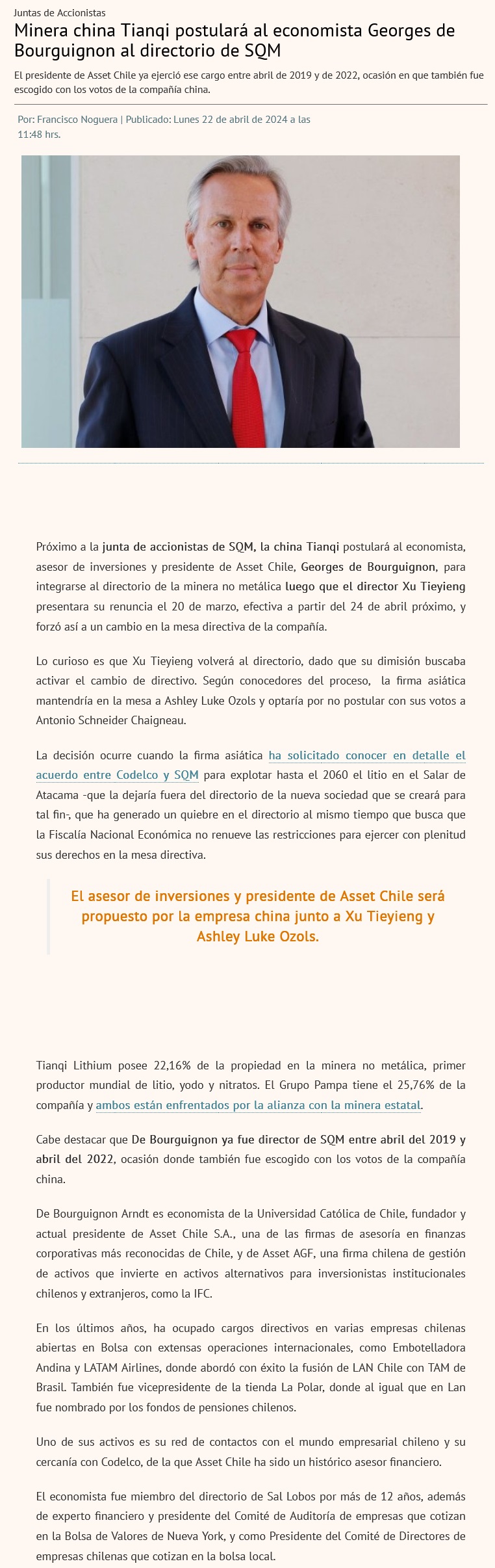 Grupo chino Tianqi define sus tres directores para SQM: Socio de Asset Chile volverá a la mesa - (La Tercera Online)