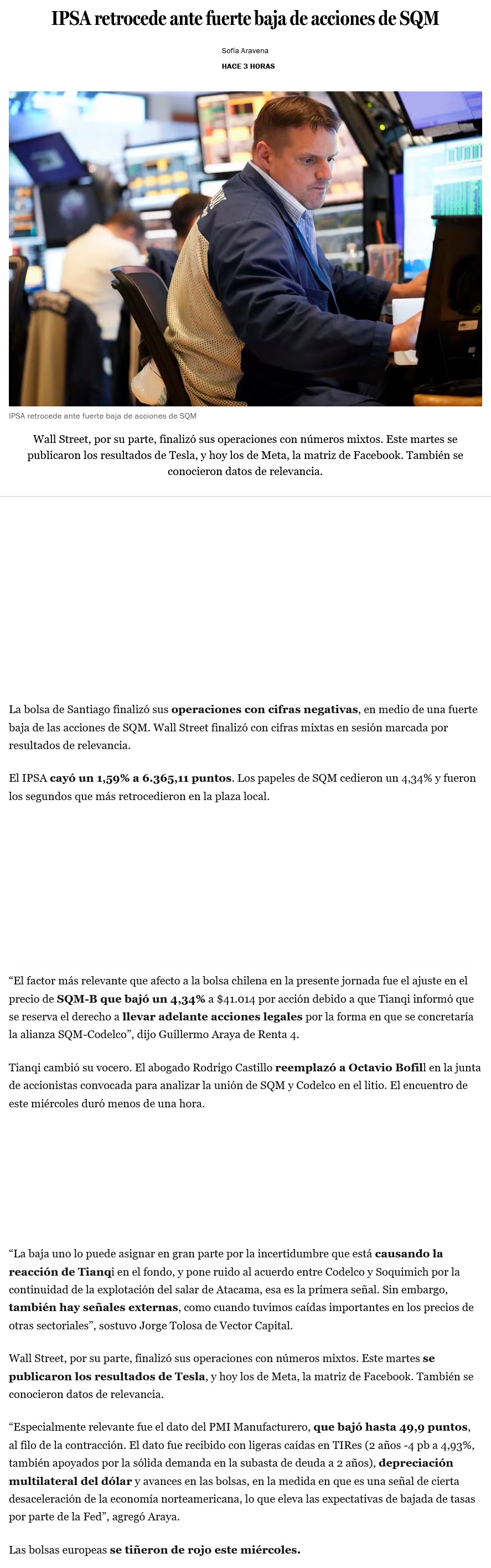 IPSA termina bajo los 6.400 puntos golpeado por SQM mientras Tesla rescata a Wall Street de los números rojos - (DF Online)
