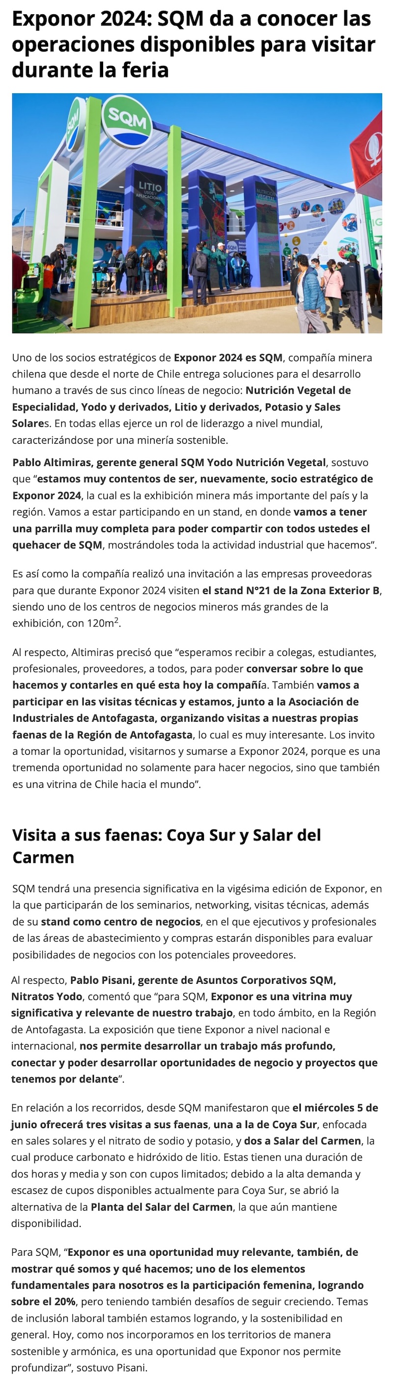 SQM estará como Centro de Negocios en EXPONOR 2024 - (madero.cl)