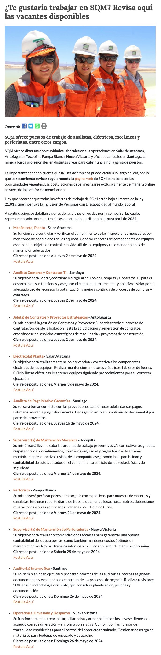 ¿Te gustaría trabajar en SQM? Revisa aquí las vacantes disponibles - (minerialocal.cl)