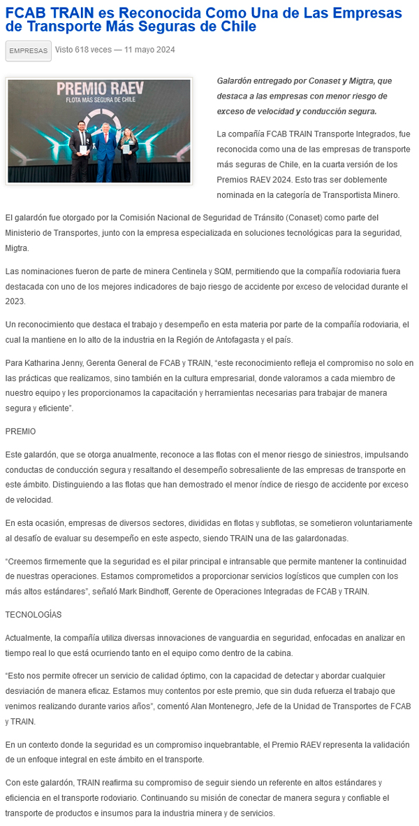 FCAB TRAIN es reconocida como una de las empresas de transporte más seguras de Chile - (elreferente.cl)