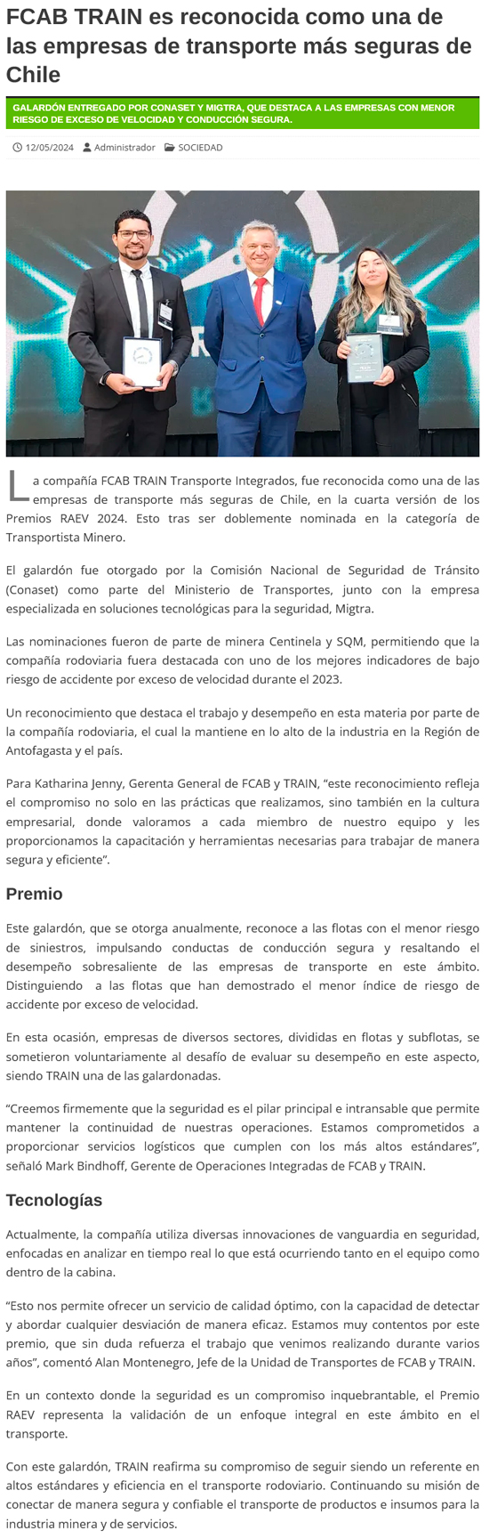 FCAB TRAIN es reconocida como una de las empresas de transporte más seguras de Chile - (region2)